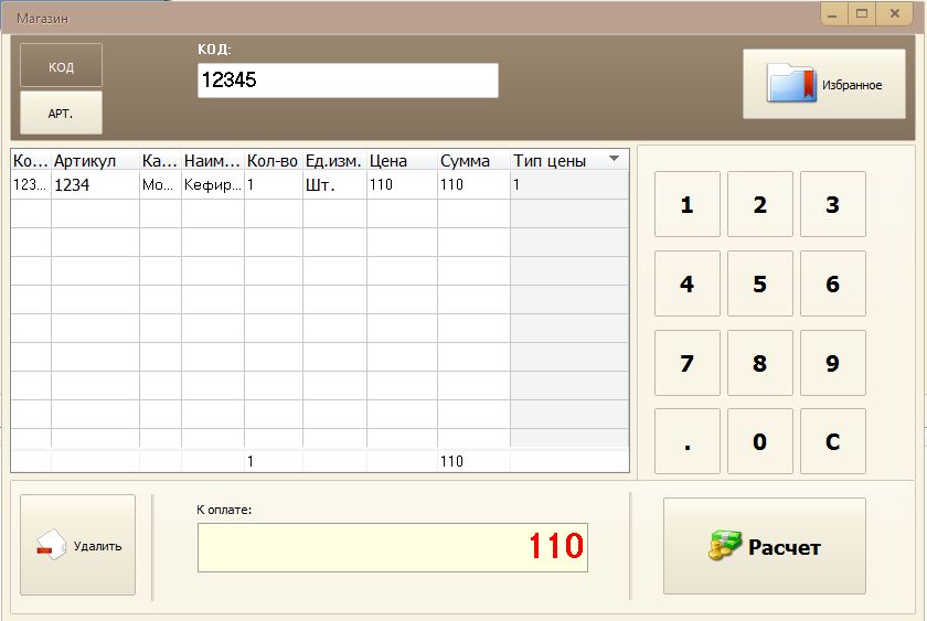 Когда товар набран в чек, можем провести расчет с клиентом, нажав кнопку «Расчет»