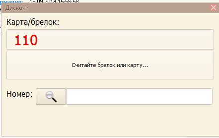 В этом окне можно считать дисконтную карту покупателя или закрыть окно и продолжить расчет.
