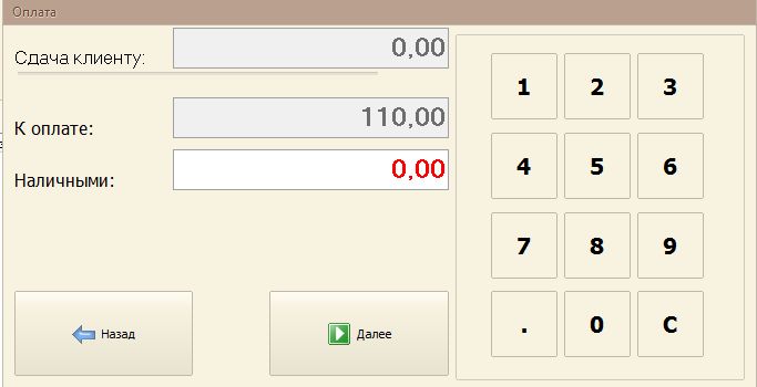 Вводим сумму наличными от клиента, использую цифровую клавиатуру и нажимаем далее.