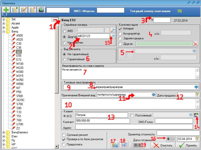 Вводим неисправность со слов клиента (как клиент говорит, так и вводим - см.рис.1 п.7), также неисправность можно выбрать из "справочника типовых неисправностей" (см.рис.1 п.8). У каждой типовой неисправности в справочнике может быть свой код, поэтому для добавления неисправности-достаточно ввести её код (см. рис.1 п.9)