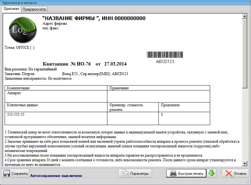 Формируется квитанция для печати. Квитанцию можно сохранить в файл или распечатать (квитанции могут автоматически сохранятся, если эта опции включена в настройках).