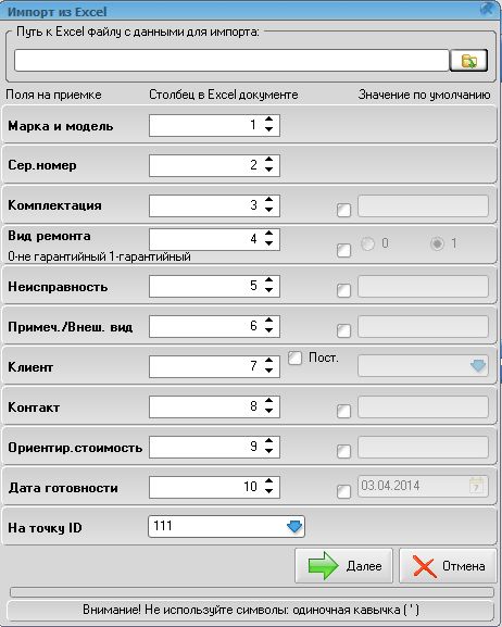 Также аппараты можно принять группой из exel файла. Пример этого файла можно найти в папке Sample exel в директории программы.
